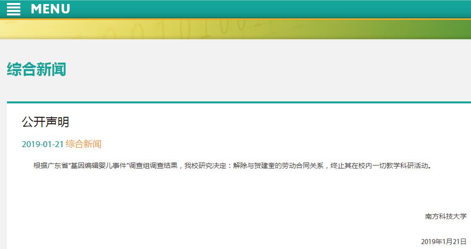 同日,南方科技大学官网发布公开声明:根据广东省“基因编辑婴儿事件”调查组调查结果,该校研究决定:解除与贺建奎的劳动合同关系,终止其在校内一切教学科研活动。