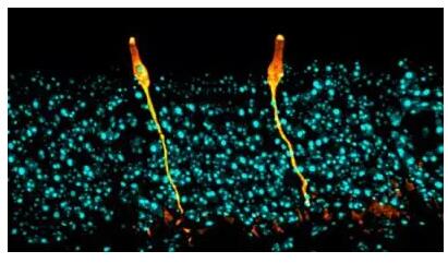 荧光显微镜下的肺部离子细胞(橙色)(图片来源:Nature)