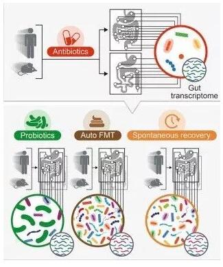 更大跌眼镜的是,第二项研究中,经过抗菌治疗的人群被分为三组,一组服用常见的11种益生菌(下图绿色);另一组则在服用抗生素前,从体内分离出肠道菌群,并在服用抗生素后,重新将这些菌群移植回体内(下图褐色);最后一组啥都不做,默默等待肠道菌群的自我修复(下图橙色)。虽然在抗生素的作用下,益生菌更容易在肠道扎根,但驻扎下来的这些益生菌非但没有帮助人体自身的肠道菌群恢复,反而还抑制了它们的生长。