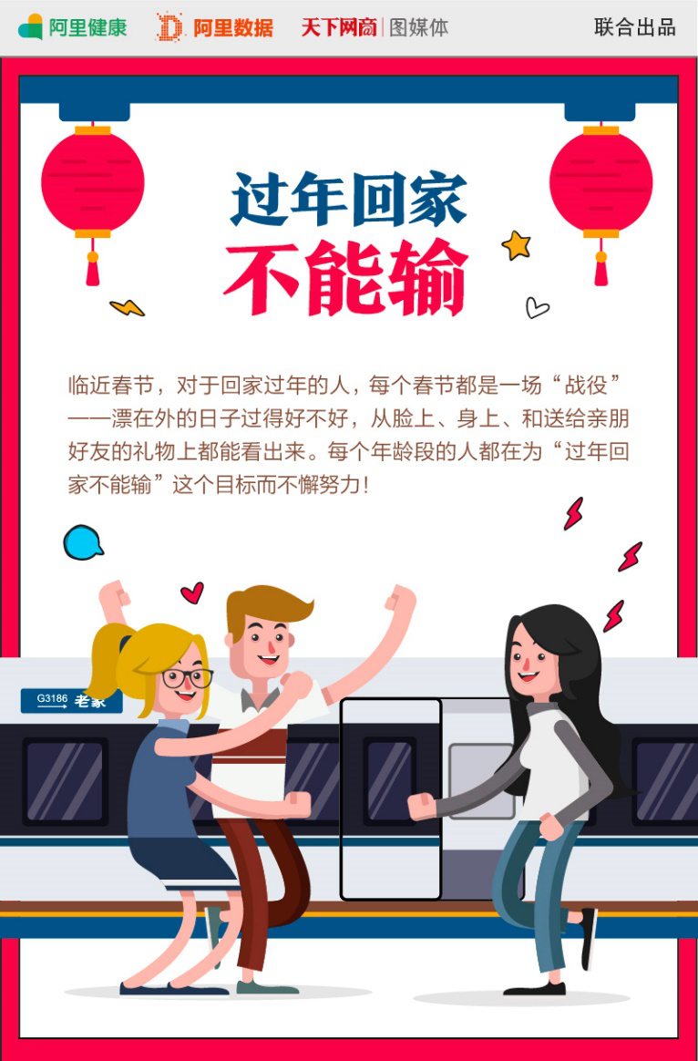1月24日,阿里健康联合阿里数据,就春节前阿里零售平台消费数据发布《春节健康消费报告》。报告显示,每个年龄段的人都在为“过年回家不能输”的目标不懈努力:可能回家相亲的90后,赶着在年前瘦脸和植发;80后作为一家的顶梁柱,忙着采购精美的健康礼盒,回家送礼不输“面儿”;而想甩掉“中年油腻男”标签的60后、70后男性们,则抓紧时间减肥瘦身,不想在老同学聚会时输掉身材。