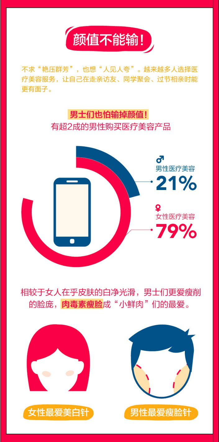 求美之心的迫切,连男士们也不例外,阿里健康电商平台2018年12月-2019年1月的销售数据显示,有超2成的男性购买医疗美容产品。但相比女性消费者追求皮肤白皙光滑,男士们则更爱消瘦的面庞,瘦脸针成为“小鲜肉”们的剁手最爱。