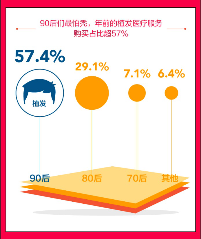 90后成为所有“变美”产品的绝对购买主力军,其中最突出的要数植发服务。阿里健康电商平台医疗服务的消费数据显示,年前购买植发医疗服务的90后占比超57%。而60后们则希望通过水光针,在春节前拥有水润透亮的皮肤。