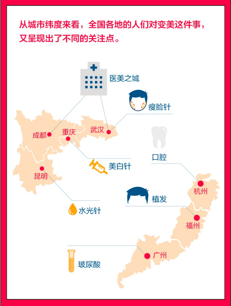 从城市纬度来看,全国各地对变美的关注点存在不同特点:福州人最喜欢植发,昆明人偏好水光针。以“出产”美女著称的成都、重庆人对美白针十分执着,川渝两地姑娘皮肤白不是没道理的。杭州人最爱购买口腔类医疗服务,广州人民则偏好玻尿酸。