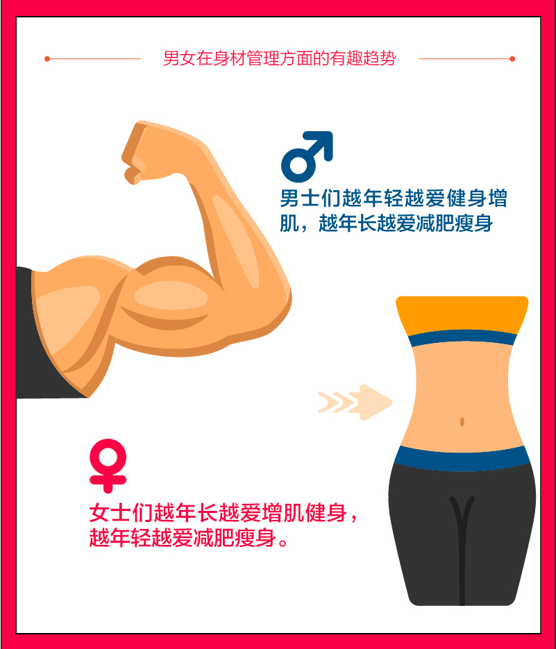 此外,各年龄段男女在身材管理方面体现了不同的偏好:男士们越年轻越爱健身增肌,越年长越爱减肥瘦身;而女士们却相反,越年长越爱增肌健身,越年轻越爱减肥瘦身。