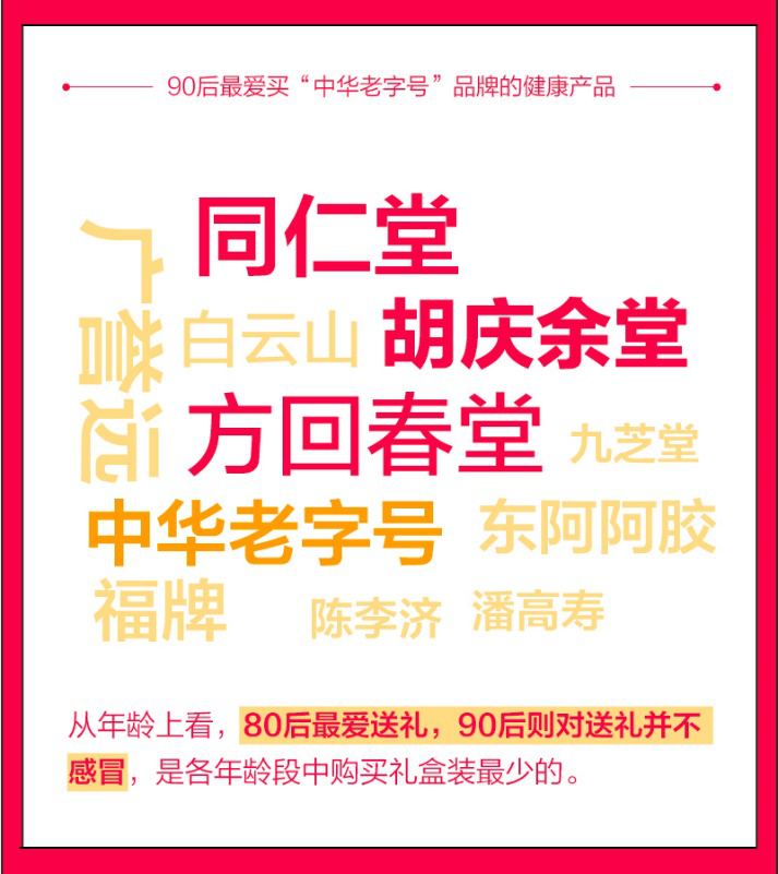 滋补保健礼盒的销售数据显示,女性消费群体购买的占比较高,65%的健康礼盒都被她们买走,而90后则是最钟爱“中华老字号”的人群。以同仁堂、胡庆余堂、方回春堂、东阿阿胶等十余个老字号健康品牌来看,90后比其他各年龄层都爱买“中华老字号”健康产品,彻底坐实年轻一代钟爱国货的风潮。