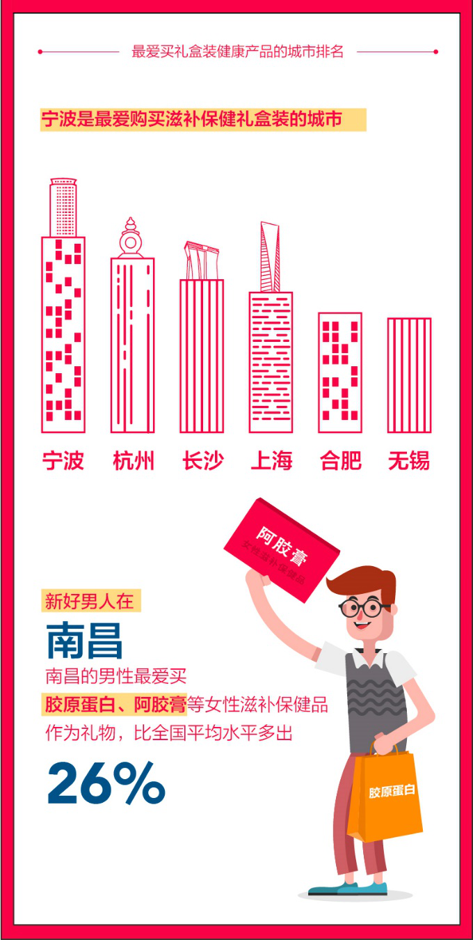 从地域维度看,宁波成为全国最爱买滋补保健品礼盒的城市,而江西南昌的男士竟然最爱买胶原蛋白和阿胶等女性美容养颜类滋补保健品,看来“宠妻狂魔”的称号,非南昌男人莫属了。