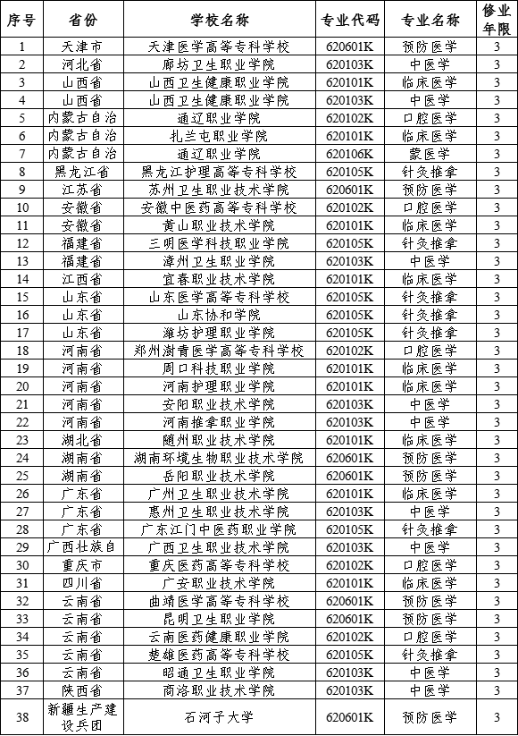 通知指出,截至2018年11月1日,教育部共受理2019年拟新设的国家控制高职专业点申请469个。经过专家评议和公安部、司法部、卫生健康委、中医药局等行业主管部门审核,同意2019年新设的国家控制高职专业点225个,其中有38个医学类相关国家控制专业点,这些专业点自2019年起可以招生,其专业名称、专业代码、修业年限等均以本通知公布的内容为准。