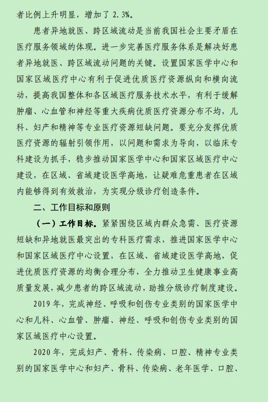 《方案》明确,2019年,完成神经、呼吸和创伤专业类别的国家医学中心和儿科、心血管、肿瘤、神经、呼吸和创伤专业类别的国家区域医疗中心设置;2020年,完成妇产、骨科、传染病、口腔、精神专业类别的国家医学中心和妇产、骨科、传染病、老年医学、口腔、精神专业类别的国家区域医疗中心设置。到2020年,建立对各类别国家医学中心和国家区域医疗中心功能定位和职责任务落实情况的考核评定机制,根据需要,设置相应专科的国家医学中心和国家区域医疗中心,建成以国家医学中心为引领,国家区域医疗中心为骨干的国家、省、地市、县四级医疗卫生服务体系。