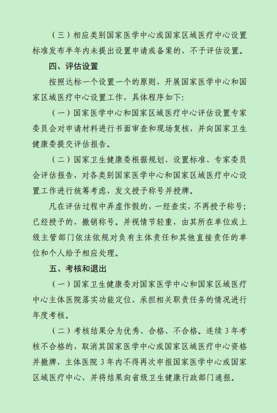 在遴选程序上,《方案》指出,省级卫生健康行政部门负责申报医院的遴选工作,按照设置规划和标准的相关规定,制定具体的遴选细则,对申报医院进行评估审核,择优选择申 报医院,形成评估报告。申报医院所在省级卫生健康行政部门制定相应类别国家级中心的建设方案。省级卫生健康行政部门将评估报告和建设方案一并报送国家卫生健康委,申报相应类别的国家医学中心或国家区域医疗中心。国家卫生健康委组织对各地申报医院利用信息系统进行复核,必要时进行现场复核,根据规划、设置标准和评估复核情况,结合业内评议,对各类别国家级中心设置建设进行统筹考虑,对通过考核的申报医院,设置成为相应类别的国家医学中心或国家区域医疗中心。