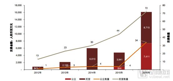 从上表可以看到,民营医院的投资数量是逐年上升的,2012年仅为13起,2016年为72起;公立医院并购事件在2012-2015年间变化不大,仅为小于5的个位数,投资金额小到忽略不计,到2016年猛然提升,上升到34起。