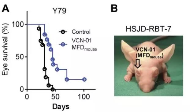 这些积极的结果,激励科学家们进一步开展了小鼠实验。在患有视网膜母细胞瘤的小鼠眼球里,他们也注射进了这种病毒。实验表明,这种病毒能对肿瘤产生一定的杀伤效果。与常规的化疗相比,它更是能延长眼球的生存期,并防止癌症往大脑转移。