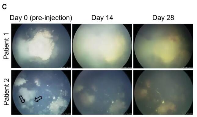 第二名患者眼中的”玻璃体种子“(下图箭头)有所减少(图片来源:参考资料[1])