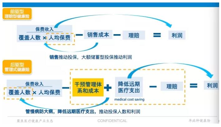 在保险公司内部,利润是由销售推动的保费营收驱动,而非medical cost saving驱动。Medical cost saving真正的内涵并不是传统控费意义上核保核赔:看投被保险人是否符合投保和理赔条件,也不是外延的健康计步运动和逆人性的健康管理。真正的medical cost saving,不是人为“控制”下降的控费,是通过疾病管理和癌症筛查等含医、患、药、数据的干预管理体系,管慢病防大病,以降低远期医疗赔付支出为目的和结果。