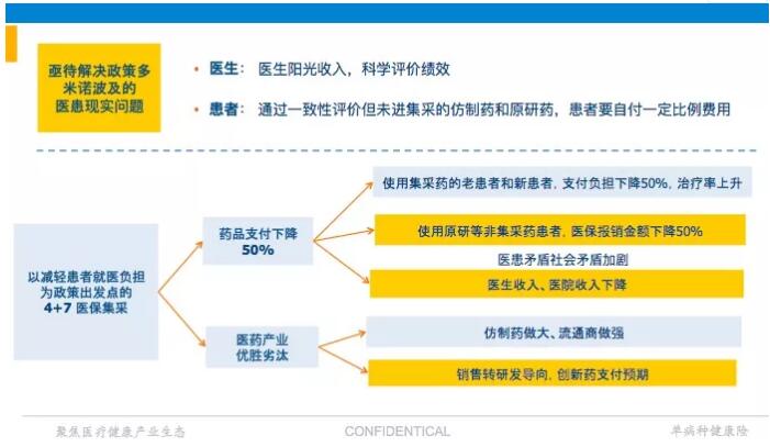 “4+7”带量采购,这个以降低患者就医负担为出发点的政策,在一定程度上,有降低医疗服务效力的风险,也可能会引发一些支付真空,这就需要商保的及时补位。