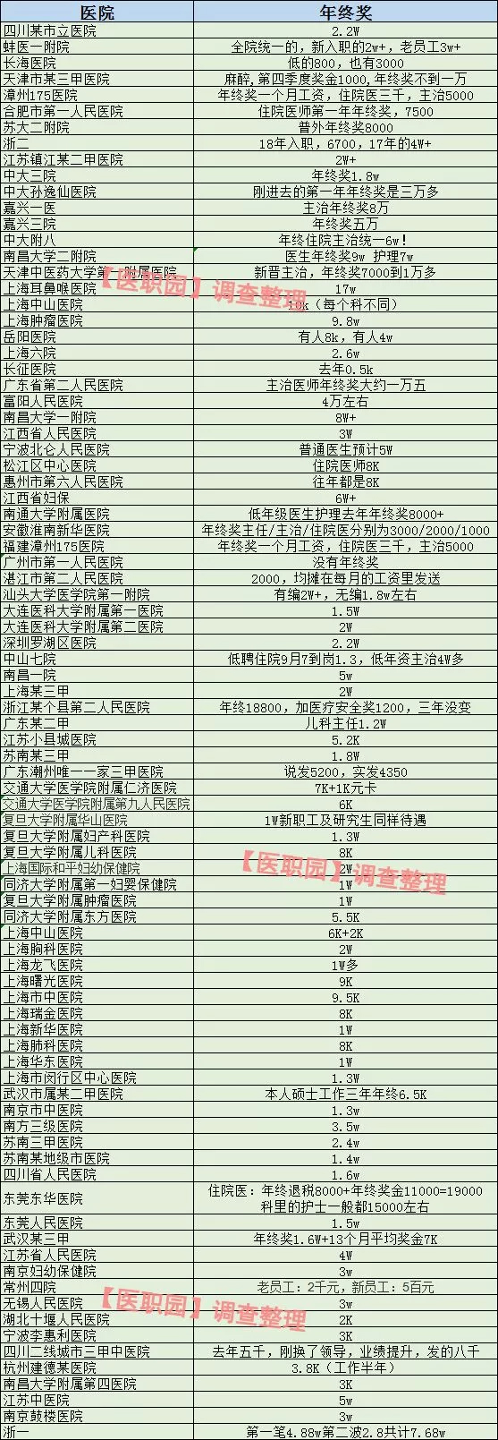 小编通过各渠道,为大家收集了87家医院的年终奖。由于年终奖涉及到部分隐私问题,有些人在分享的时候,并没有透露具体的医院或科室,数据仅供参考。