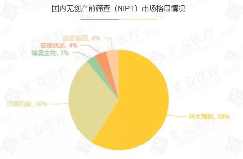 在国内无创产前筛查(NIPT)市场中,华大基因布局较深,市场占比将近60%,贝瑞和康占比30%,前两名企业占比将近90%,形成了明显的寡头格局。排在第3-5名的达安基因、安诺优达和博奥生物总占比仅为11%。