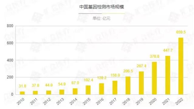 我国基因检测行业的整体规模在2011年为31.8亿元,截至2017年已上涨至158亿元,7年增长至原来的近五倍,复合年平均增长率25.7%,预计到2022年,总规模将突破650亿元。