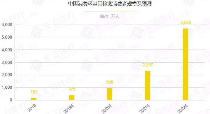 从应用的角度来讲,基因检测除科研和临床级应用以外,还包括在消费级和司法应用。消费级应用场景主要包括疾病易感基因检测、祖源分析、运动基因、皮肤特性、个性天赋、营养代谢和药物代谢等。预计2018-2020年消费级基因检测消费者规模停留在百万级别,但随着人们对基因检测的认知的增强和技术的发展,预计2021年将超过2000万,2022年将超过5000万。