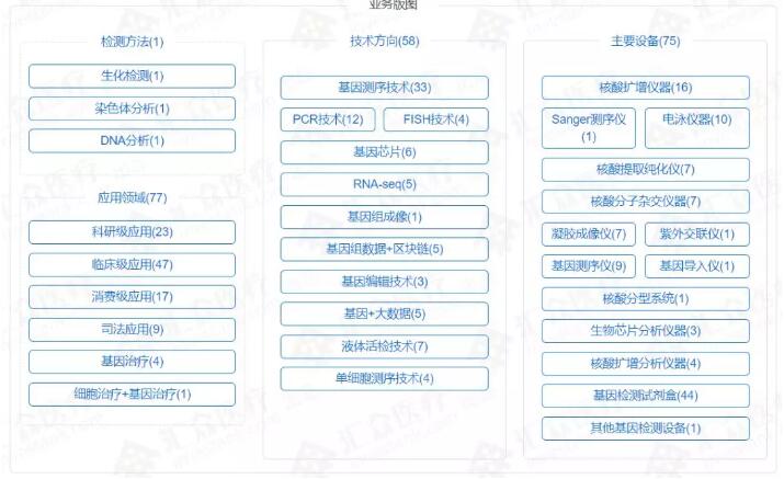 下游同时包括临床端(医院、体检中心、医学检验机构等)和科研端(院所、学校和制药公司),以及基因相关数据平台和分析服务商,同时包括基因组城乡分析服务和基因疗法服务商。