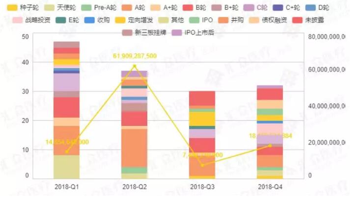 2018年第一季度累计投资额148.5亿元,其中从天使轮到C轮总计35起,新三板挂牌、定增和并购事件各有2起;