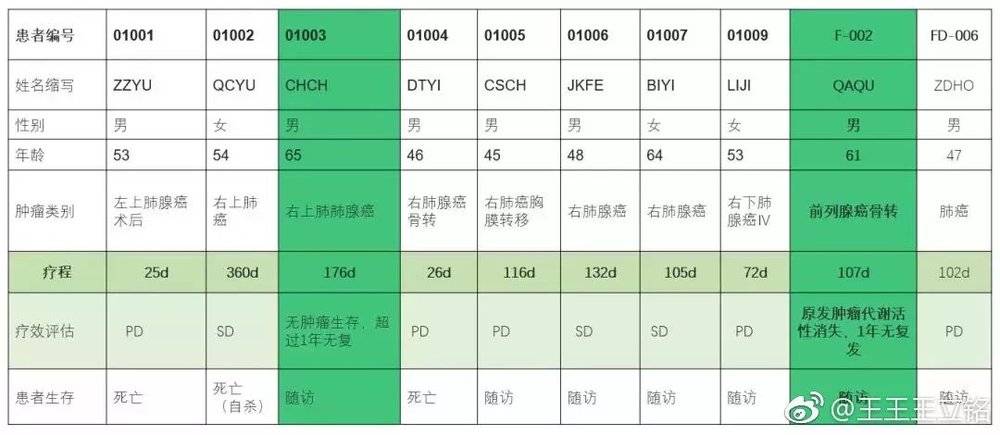十个患者,五个注明了PD(疾病进展),三个SD(疾病稳定)。还有两个标绿的患者,没有说明CR/PR/SD/PD的情况,是单独用文字解释的,就是陈小平演讲当中提到的“可能已经治好”的病人。