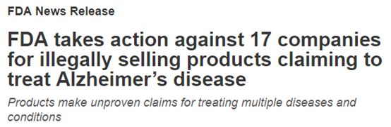 在过去5年里,FDA已向非法销售80多种阿兹海默病治疗产品的公司发出了40多封警告信。近年来,FDA还对非法声称治疗癌症等疾病的膳食补充剂加强了监管。然而,仍然有很多不安全和未经批准的产品大量销售,这些保健品公司可以在网络上轻易转移销售点。