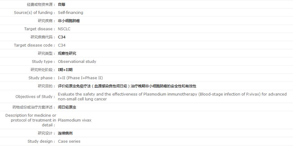 该项目的伦理委员会批件附件显示,项目于2015年12月21日由广州医科大学附属第一医院医学伦理委员会 批准同意。该研究目的为评价疟原虫免疫疗法(血源感染良性间日疟)治疗晚期非小细胞肺癌的安全性和有效性,研究实施地点为广州医科大学附属第一医院(三级甲等)。招募志愿者80人,经费或物资来源显示自筹。