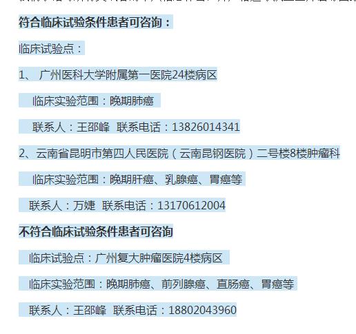 临床试验地点即为上述三个项目所实施的广州医科大学附属第一医院、云南昆钢医院、广州复大肿瘤医院。临床实验范围包括晚期肺癌、晚期肝癌、乳腺癌、胃癌、前列腺癌、直肠癌等。
