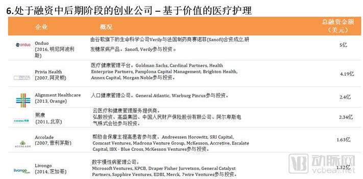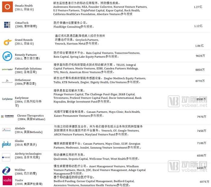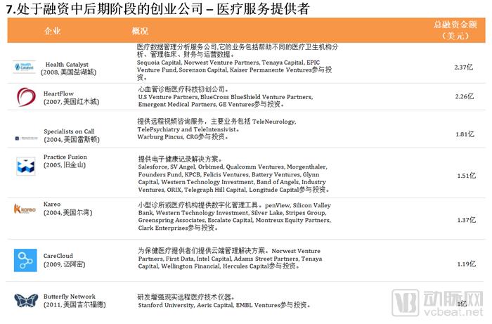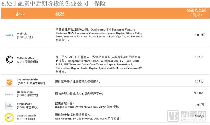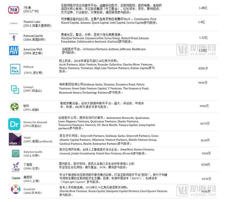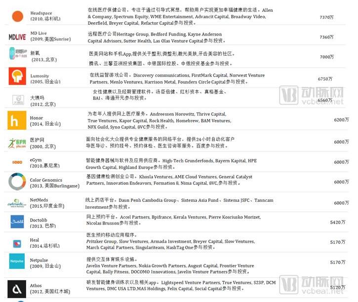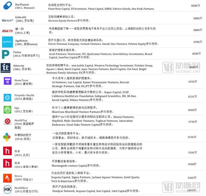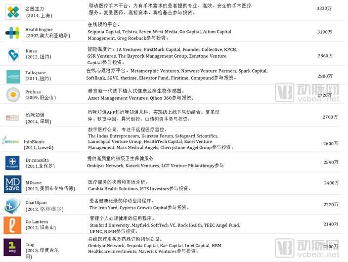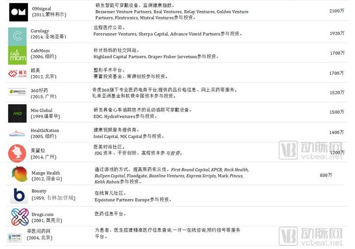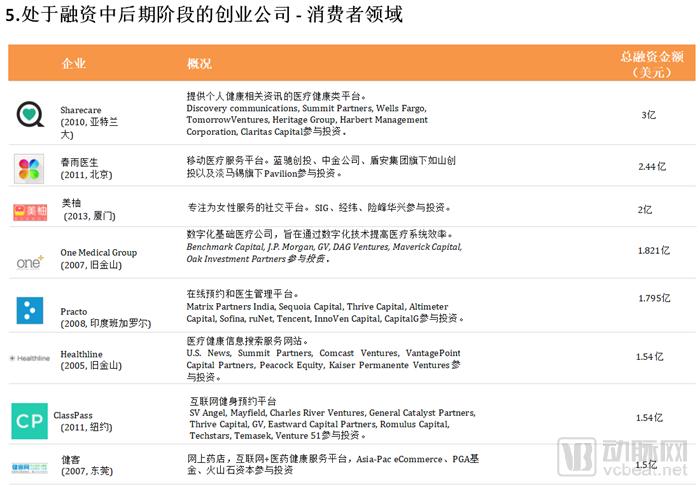 中后期“预备队”中,中国公司包括:春雨医生、美柚、健客、七乐康、咕咚、丁香园、趣医、新氧、大姨妈、医护网、华米、妈咪知道、名医主刀、越美、360好药、寻医问药网等。