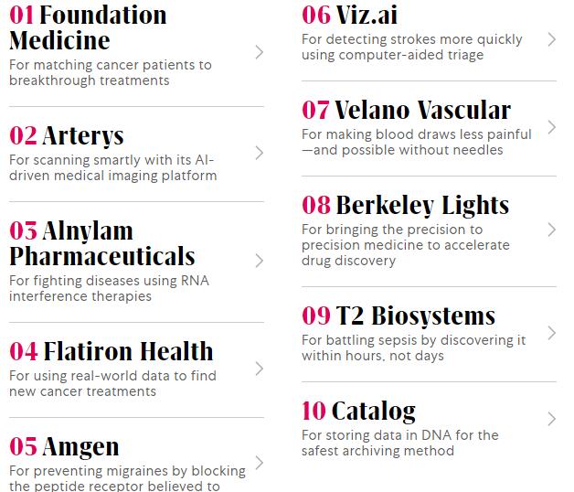 自2008年以来,美国三大商业媒体之一《快公司(Fast Company)》每年推出的“全球最佳创新公司50”(Most Innovative Companies 50,简称MIC50,或Fast50),已成为全球享誉盛名的榜单。近日,《快公司》发布2019年榜单,其中生物技术行业选出了10家对患者治疗有重大积极影响的公司。以下是每家公司的详情。