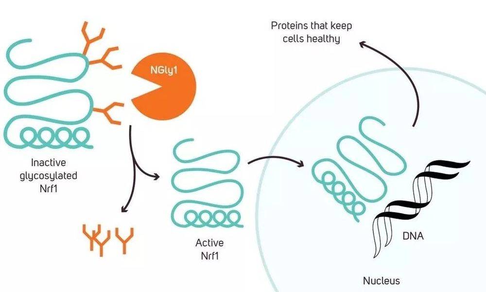 因为相信,所以看见。2016年,没有放弃希望的马特终于等来了曙光。作为协助马特的100多名科学家之一,麦克阿瑟天才奖得主卡罗琳·贝尔托齐(Carolyn Bertozzi)教授精准地揭示了NGLY1蛋白参与的生物学通路——在细胞内,有一种叫做Nrf1的转录因子。只有当它表面的糖分子被移除后,才能发挥正常作用。而NGLY1的功能,正在于此。