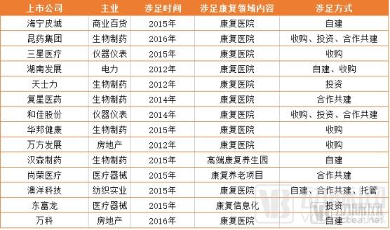 最近几年,随着政策的放开,民营康复医院的发展非常迅猛,据动脉网的不完全统计,截止2017年,有14家上市公司涉足康复领域。