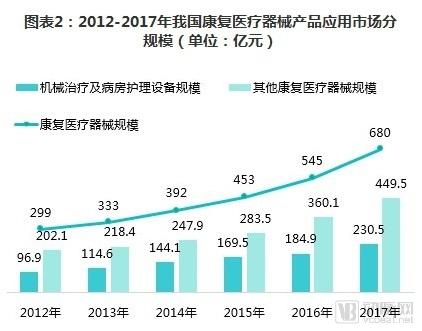 据前瞻产业研究院数据显示,康复医疗器械规模逐年增长。2017年我国机械治疗及病房护理设备规模为230.5亿元,其他康复医疗器械市场规模为449.5亿元,整个康复医疗器械市场规模达680亿元