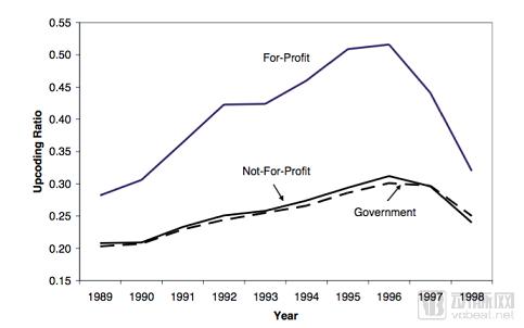 图2 美国不同营利性与非营利性医院高编码情况对比(1989-1998)
