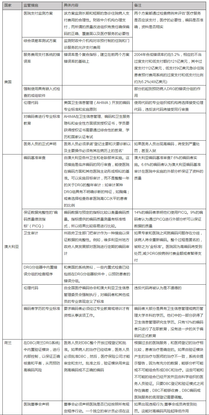 表1 美、澳、荷三国DRG高编码控制系统的对比