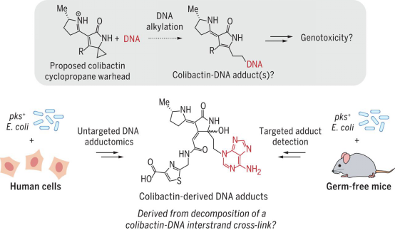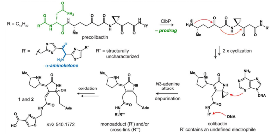 在过去十年中,研究人员通过多种互补方法研究了关于colibactin化学结构的间接信息。对pks+ E. coli突变菌株代谢物的分离和结构表征显示,colibactin可能含有环丙烷环,它是DNA烷化类损伤试剂中的活性基团,因此研究人员假设colibactin通过环丙烷基团对DNA进行共价修饰。