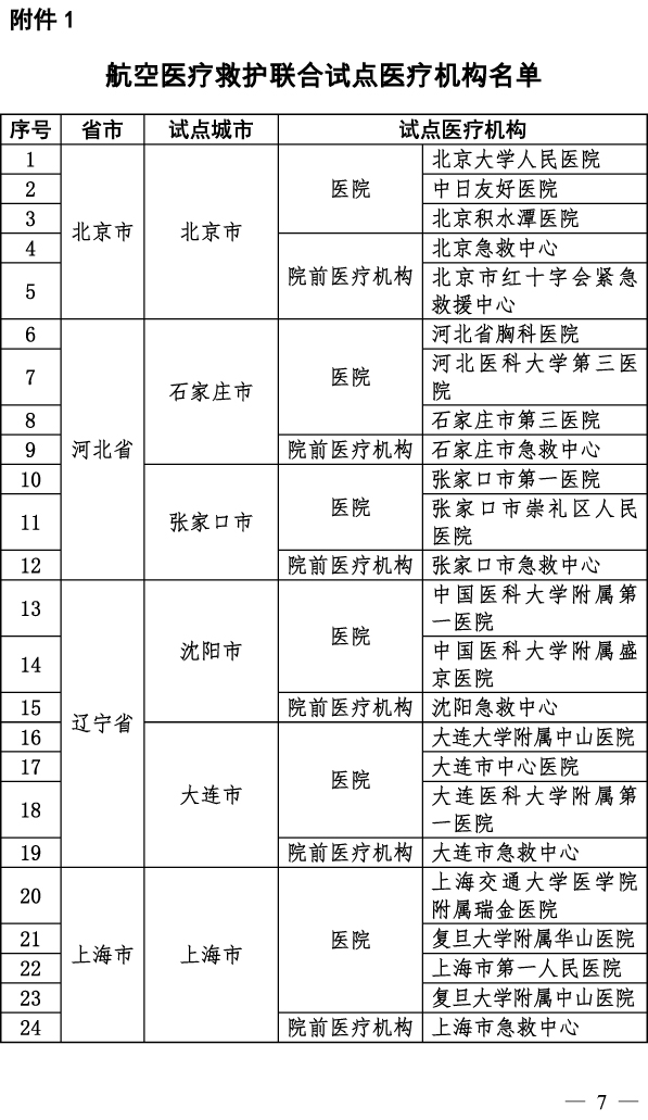 近期,中国民用航空局、国家卫健委联合公布《航空医疗救护联合试点工作实施方案》,在12个省(市)开展航空医疗救护联合试点工作。试点医院原则上为三级甲等综合性医院,具有较强的教学能力和较强的辐射能力,同时为急救中心急救网络医院。