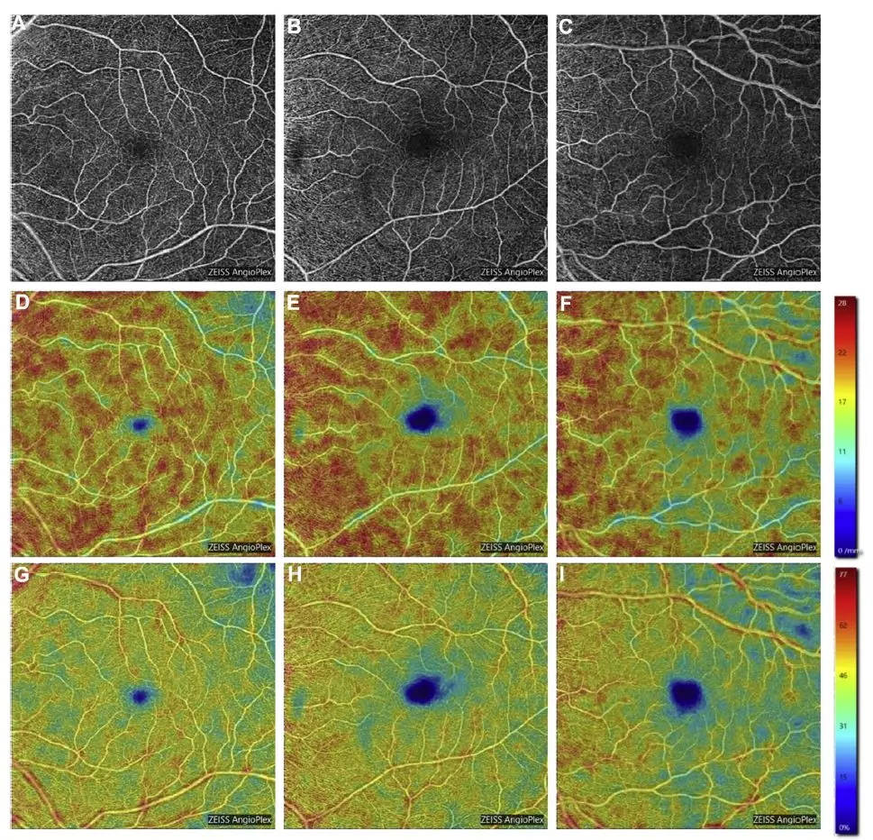 图|对正常人(A)、轻度认知障碍(B)和 AD 患者(C)进行的 3×3mm OCTA 扫描(来源:Retinal Microvascular and Neurodegenerative Changes in Alzheimer's Disease and Mild Cognitive Impairment Compared with Control Participants)