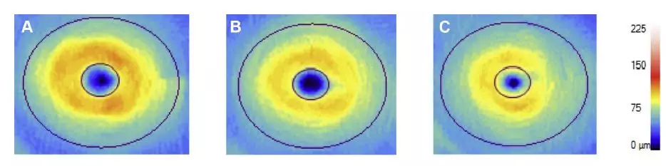 图|对正常人(A)、轻度认知障碍(B)和 AD 患者(C)进行左眼黄斑的代表性 OCT 图像的神经节细胞分析(来源:Retinal Microvascular and Neurodegenerative Changes in Alzheimer's Disease and Mild Cognitive Impairment Compared with Control Participants)
