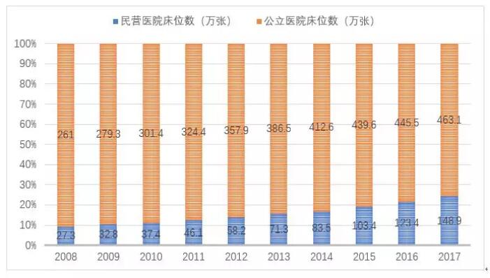 民营医院和公立医院的床位数均呈现逐年上升趋势。从2008年到2017年,公立医院床位数量由261万张扩大至463.1万张,增加了 77.4%;民营医院床位数量由27.3万张扩大至148.9万张,增加了445.4%。公立医院床位数在全国总床位数量中的占比由90.5% 下降到75.7%;同期,民营医院占比由9.5%增长到 24.3%。这意味着民营医院在机构数量快速增长的同时,规模也有明显扩大。