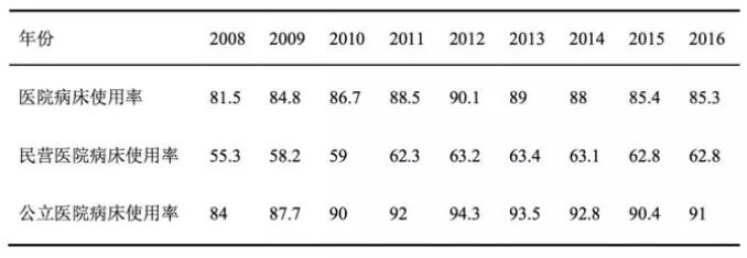 从2008年到2017年,我国公立医院的病床使用率从84.0%逐年增加至91.3%;民营医院的病床使用率同样呈增长趋势,从55.3%逐年增加至63.4%。与公立医院相比,民营医院病床使用率有近30个百分点的差距。