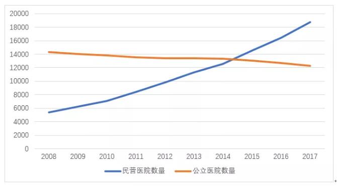 公立医院的数量逐年减少,民营医院的数量逐年增加。公立医院数量从2008年的14309家逐年减少至2017年的12297家,下降幅度为14.1%;同期,民营医院数量从5403家逐年增加至18759家,增长幅度为247.2%。从结构上看,公立医院在全国医院总数量中的占比由72.6%下降至39.6%;民营医院占比由27.4%逐年上升至 60.4%。