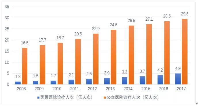 公立医院诊疗人次由2008年的16.5亿人次逐年增加到2017年的29.5亿人次,增幅达78.8%,年平均增长率为8.8%。民营医院诊疗人次从1.3亿人次逐年增加到4.9亿人次,增幅达277.0%,年平均增长率为 30.8%,增长幅度和增长速度远高于公立医院。
