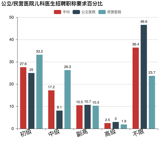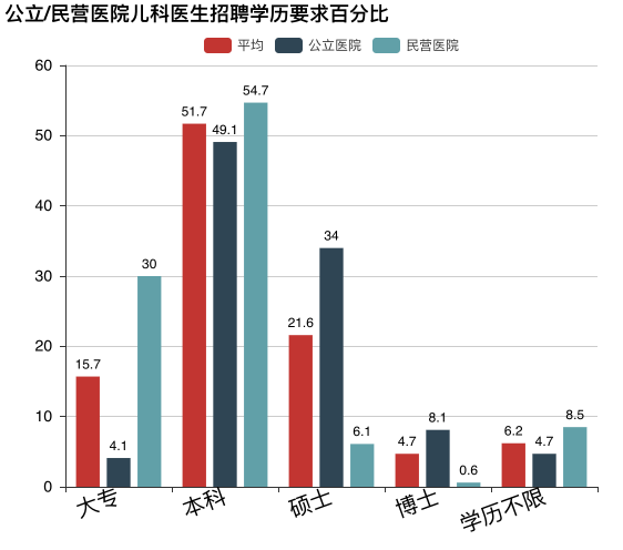 可见,民营医院要求的初级和中级职称较公立医院更多,而公立医院要求的副高和高级职称较民营医院更多。另外,公立医院所招聘的儿科医生中,更多的是不限。说明,对于学历较好的毕业生,只要愿意干儿科这行,更有可能先进公立医院。也可以说明,公立医院对基层儿科医生需求多,民营医院对中级儿科医生需求多。