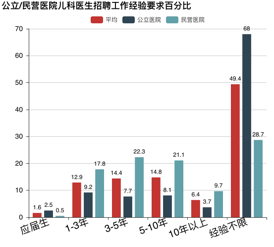 公立医院更多的是经验不限,也说明了公立医院对基层儿科医生需求多这一点。可以看到,民营医院对于经验的需求普遍高于公立医院。综上可知,民营医院更看重工作经验,只要你工作经验足够,哪怕学历和职称低一些都没有关系。