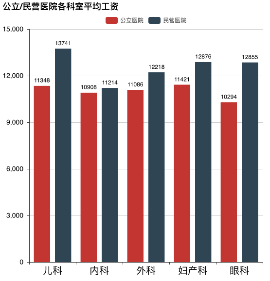 奇怪,数据显示的是儿科医生的工资是最高的呀!不是说儿科医生是干最累的活儿,拿最低的工资吗?别急,看看公立和民营的对比。