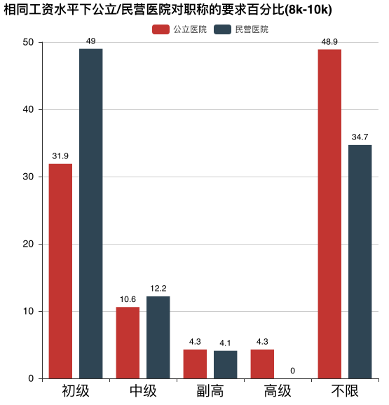 可能你会说,前面不是说公立医院更多招聘的是不限经验的吗?这样来对比工资水平不合适!那么我们来看看相同工资水平下,公立和民营对医生的学历要求有什么不同。