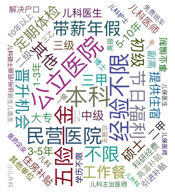 我们最后把招聘单位对于儿科医生的任职要求以及招聘单位能提供的福利画成了词云图。