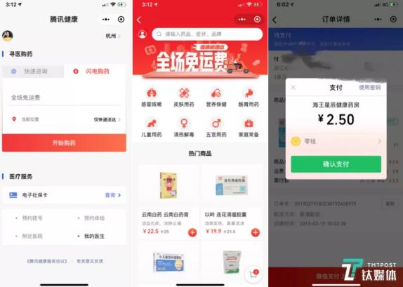 从左到右依次为腾讯健康小程序首页、闪电购药页面、购药支付页面(钛媒体付梦雯制图)