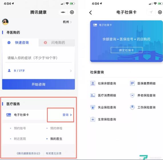 在腾讯健康小程序中有电子社保卡查询绑定功能,但患者绑定电子社保卡后,在线上使用医保购买药品这一功能目前尚未实现。
